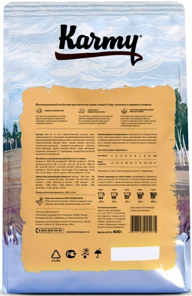 Корм для кошек сухой Карми гипоаллергенный для взрослых животных, склонных к пищевой аллергии, гранулы с уткой 400г / кошачья еда для ежедневного