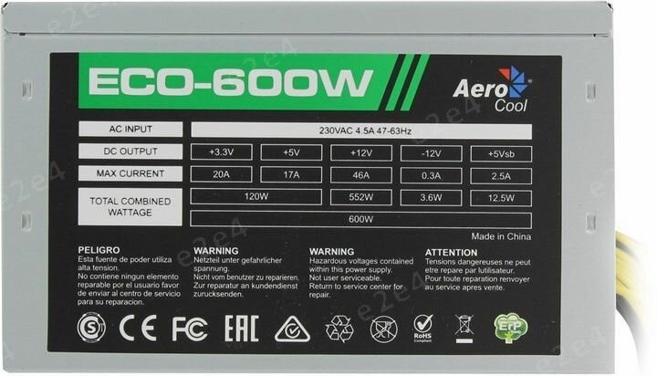 Aerocool 600W Retail ECO-600W ATX v2.3 Haswell, fan 12cm, 400mm cable, power cord, 20+4P, 12V 4+4P, 1x PCI-E 6+2P, 4x SATA, 3x PATA, 1x F