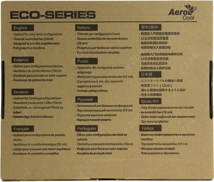 Aerocool 600W Retail Eco-600w ATX v2.3 Haswell, fan 12cm, 400mm cable, power cord, 20+4P, 12V 4+4P,