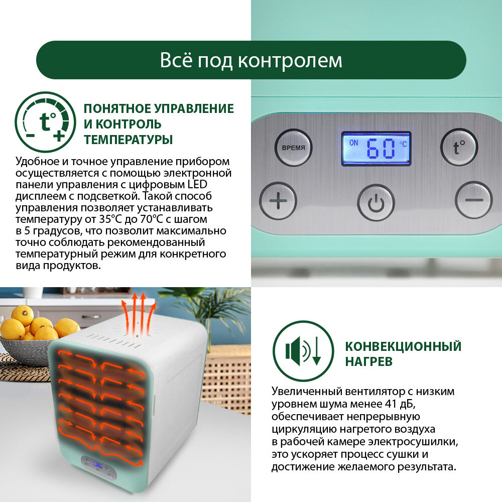 объем, скорость работы вентилятора и равномерный нагрев во всей сушилке.