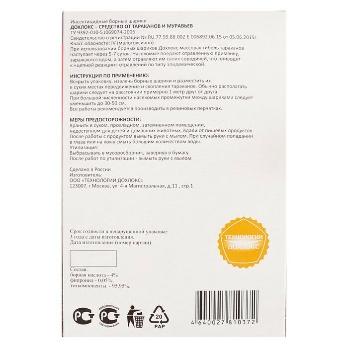 Средство от насекомых Дохлокс Борные шарики от тараканов, 8 шт