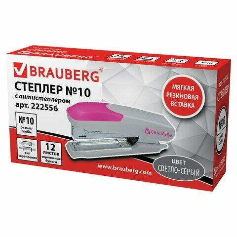 Степлер №10 BRAUBERG "Delta", до 12 листов, с резиновой накладкой и антистеплером, серый, розовая вставка, 222556, 1 шт