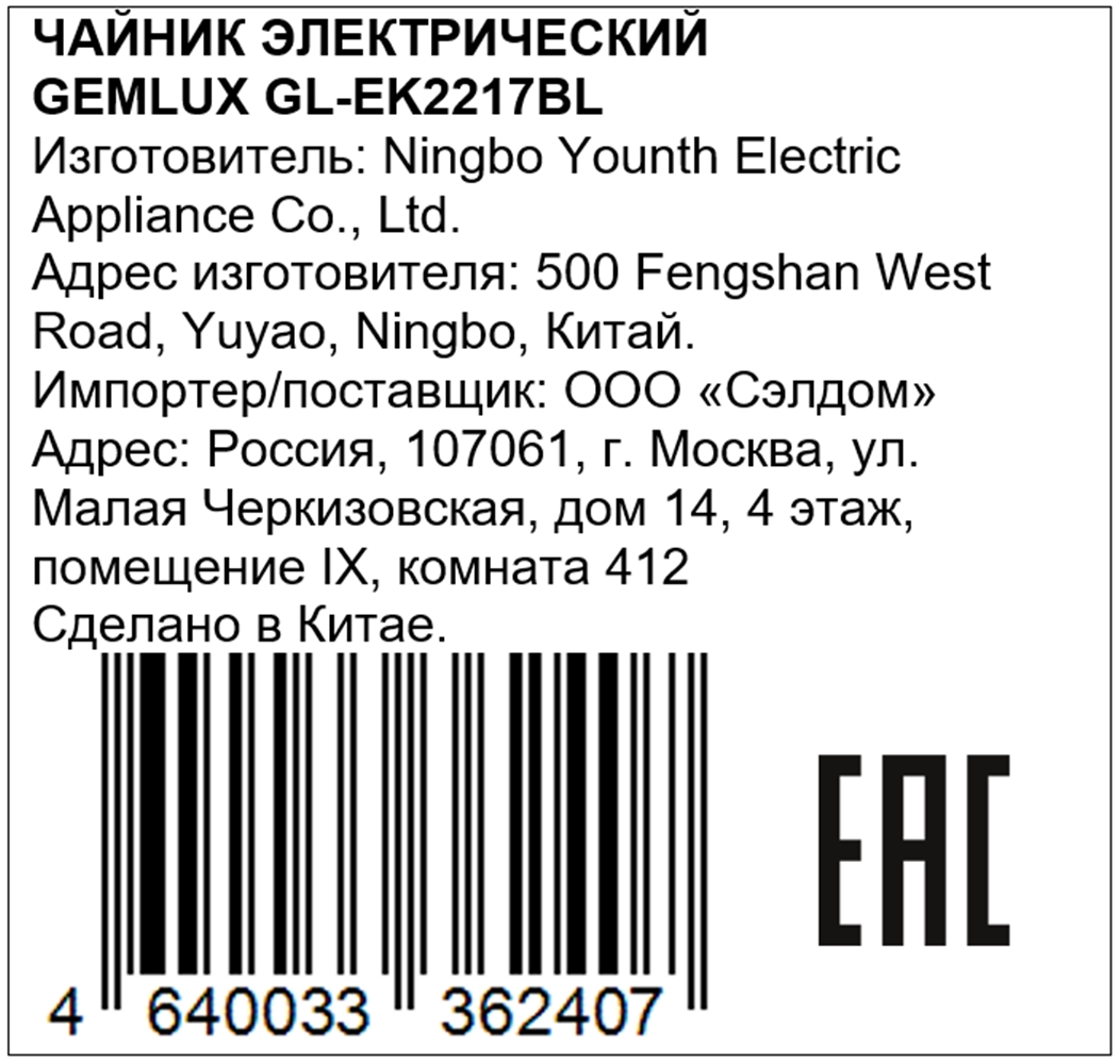 Купить Чайник электрический GEMLUX GL-EK2217BL