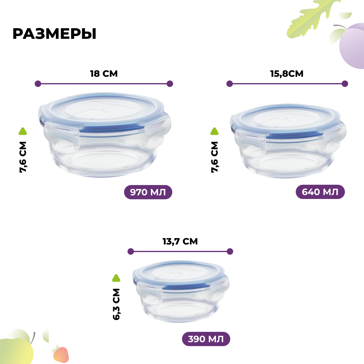 Набор из 3х стеклянных пищевых контейнеров Eley 390 мл, 640 мл и 970 мл