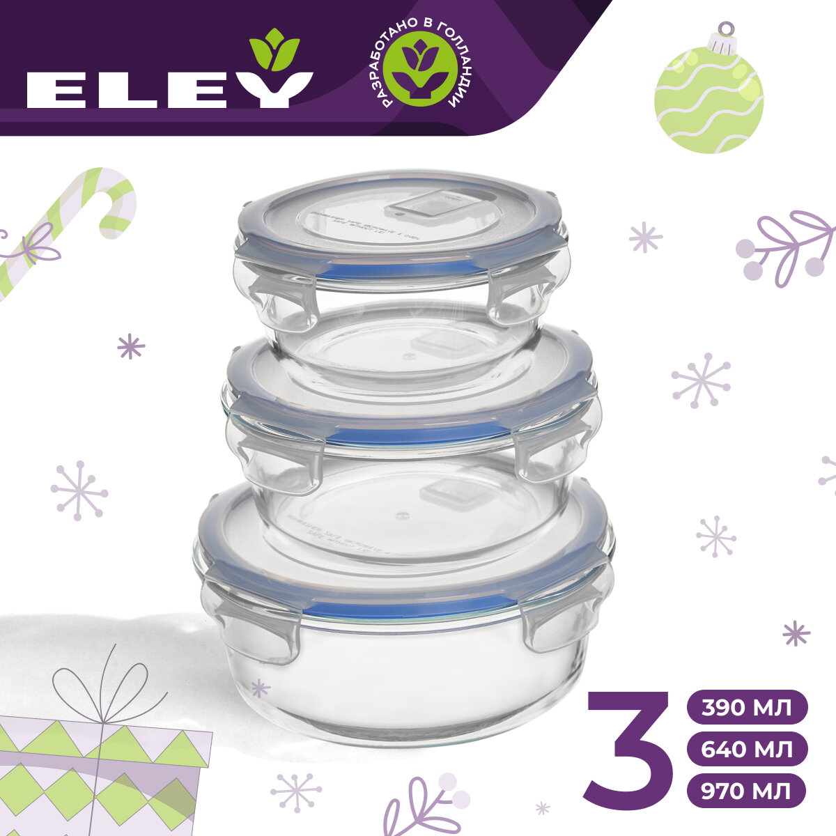 Купить Набор пищевых контейнеров для еды из жаропрочного стекла ELEY 3 штуки: 390 мл, 640 мл и 970 мл ELSTP002B