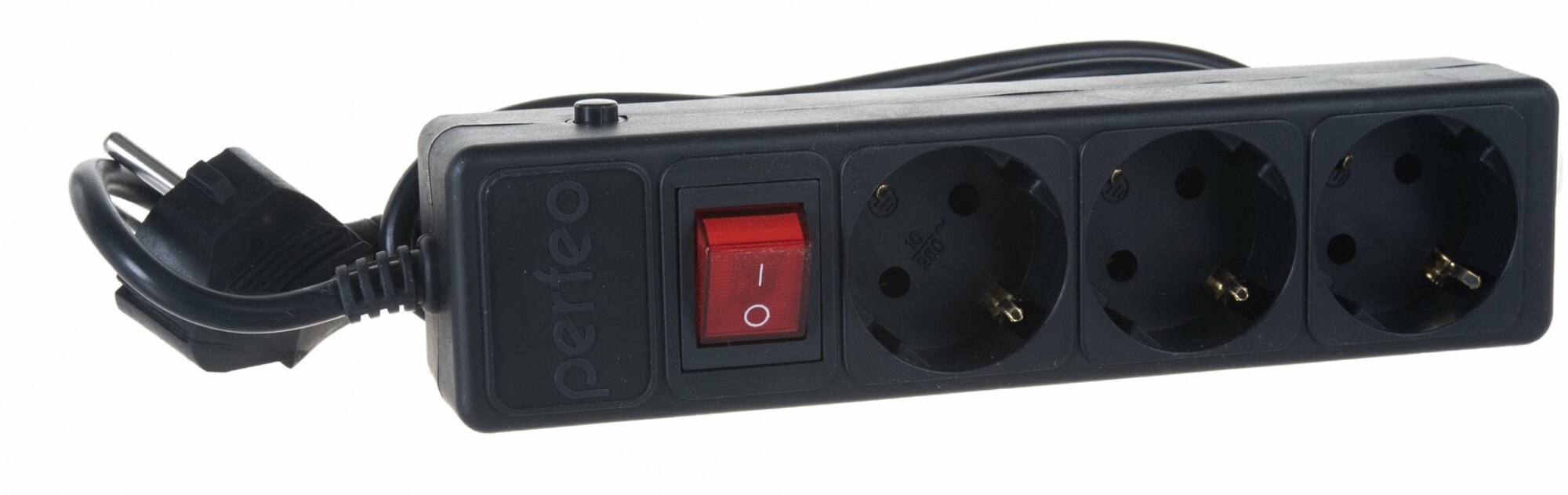Сетевой фильтр с заземлением и кнопкой Perfeo Power+, 1,8 м, 3 розетки (черный)