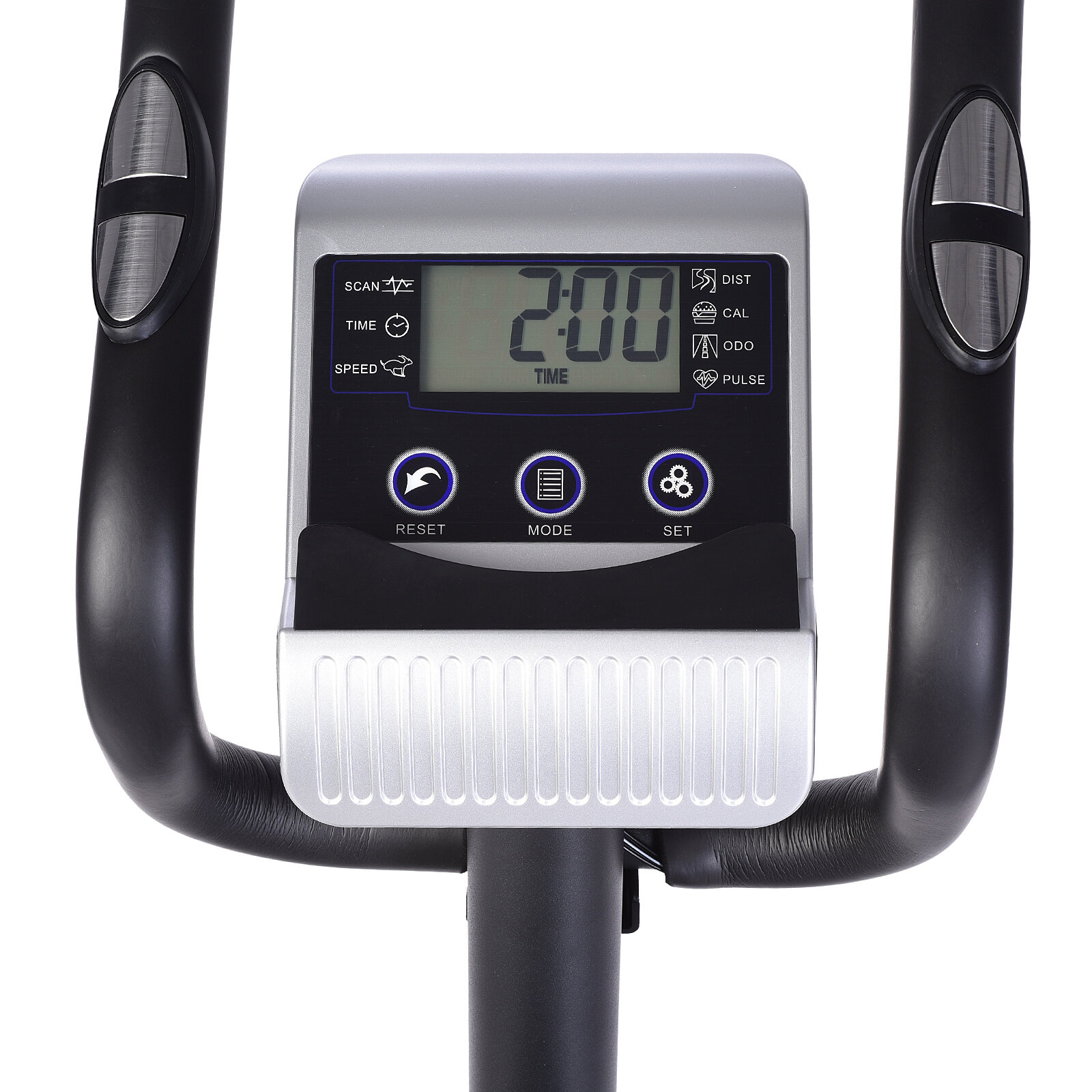| Плюсы: | Тяжелый маховик, неплохая длина шага, компьютер с основными параметрами, органичный дизайн, ролики для передвижения по комнате. |