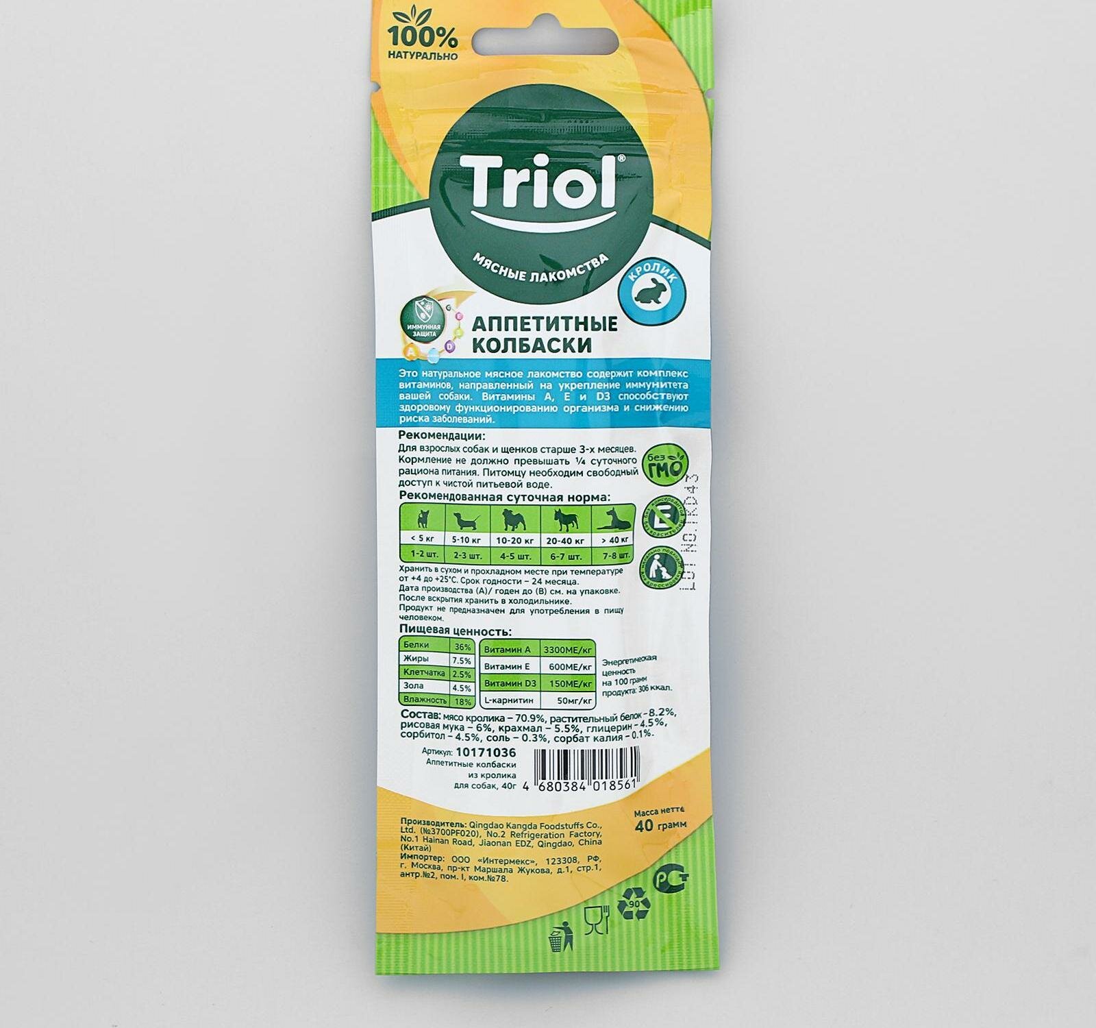 Triol (лакомства) Аппетитные колбаски из кролика для собак 40г 10171036 0,040 кг 42671 (1 шт)