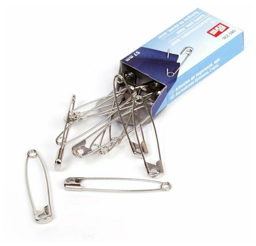 085226 Булавки английские, сталь с защитой от ржавчины, со спиралью, 57мм, серебристый, коробка 12шт