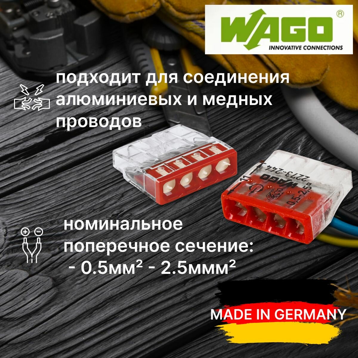 Клеммник WAGO четверная (одножильных) х 0,5-2,5 мм2 24A Cu/Al с пастой "Alu-Plus" 2273-244 (комплект 8шт)