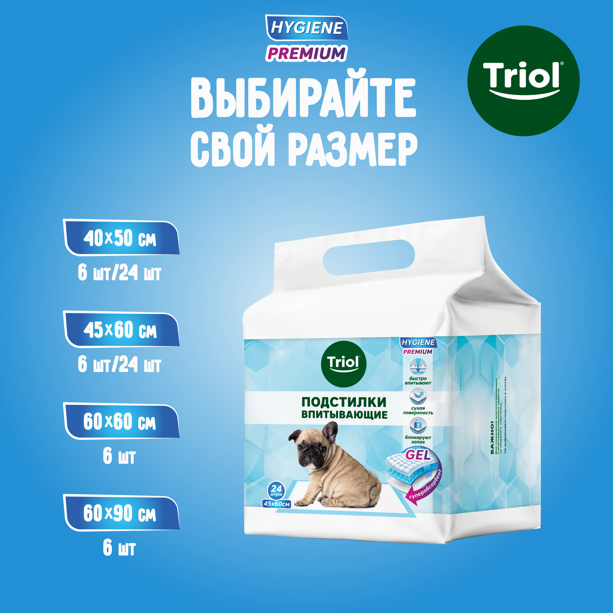 Подстилки для животных впитывающие "Triol", для туалета, 45 см х 60 см, 24 шт