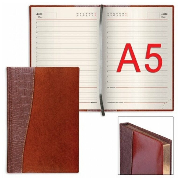 Ежедневник BRAUBERG недатированный, А5, 138х213 мм, Cayman, комбинированная кожа, 160 л., корич./темно-кор., крем. бл., зол.срез, 125084