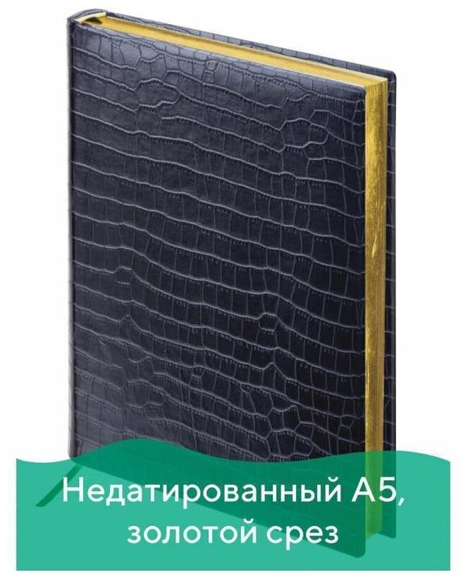 Ежедневник BRAUBERG недатированный, А5, 138х213 мм, Comodo, под матовую крокодиловую кожу, 160 л., черный, крем. блок, зол.срез, 124974