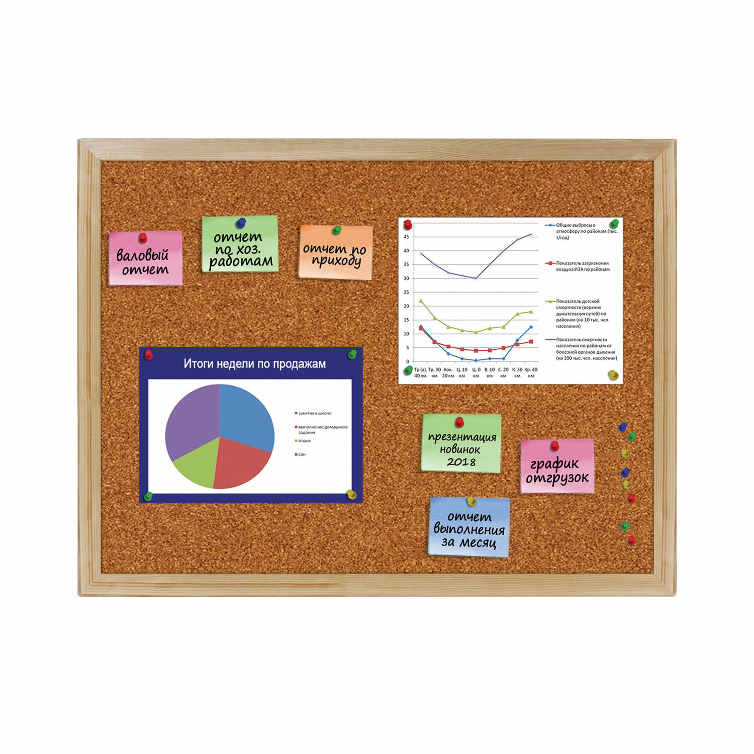| Плюсы: | Отличная доска, выполняет свои функции. Висит. Пины крепятся отлично. Держит чеки из магазинов. |