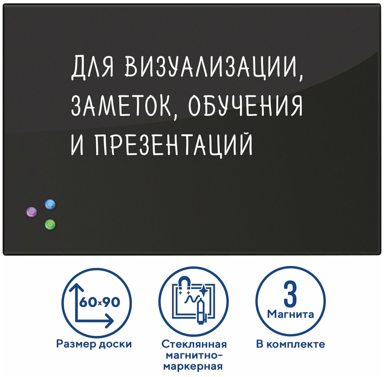 Доска магнитно-маркерная стеклянная (60×90 см), 3 магнита, черная, BRAUBERG