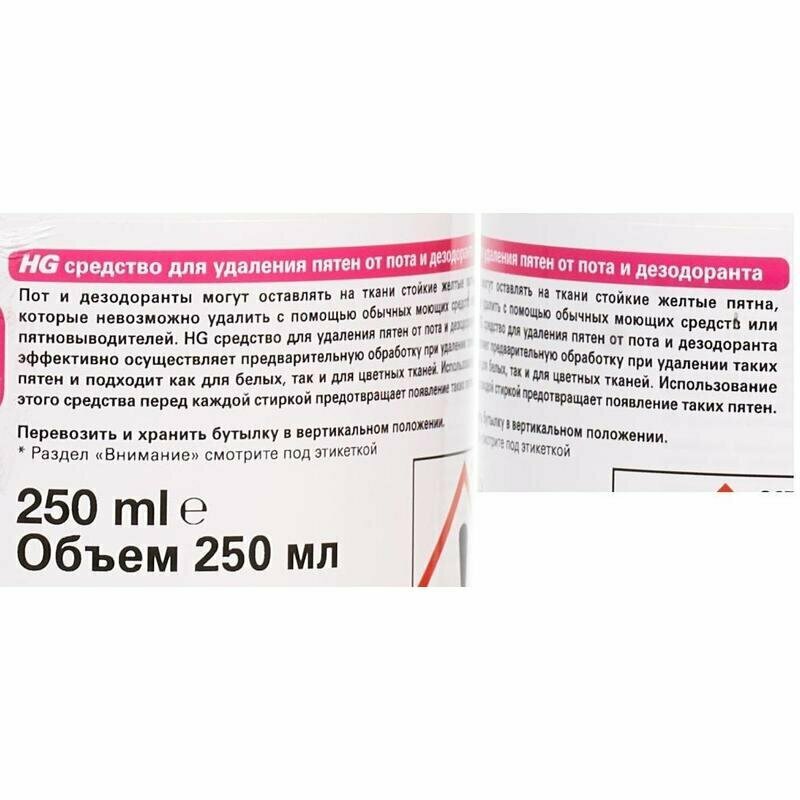 Пятновыводитель HG для удаления пятен от пота и дезодоранта, 250 мл, 250 г