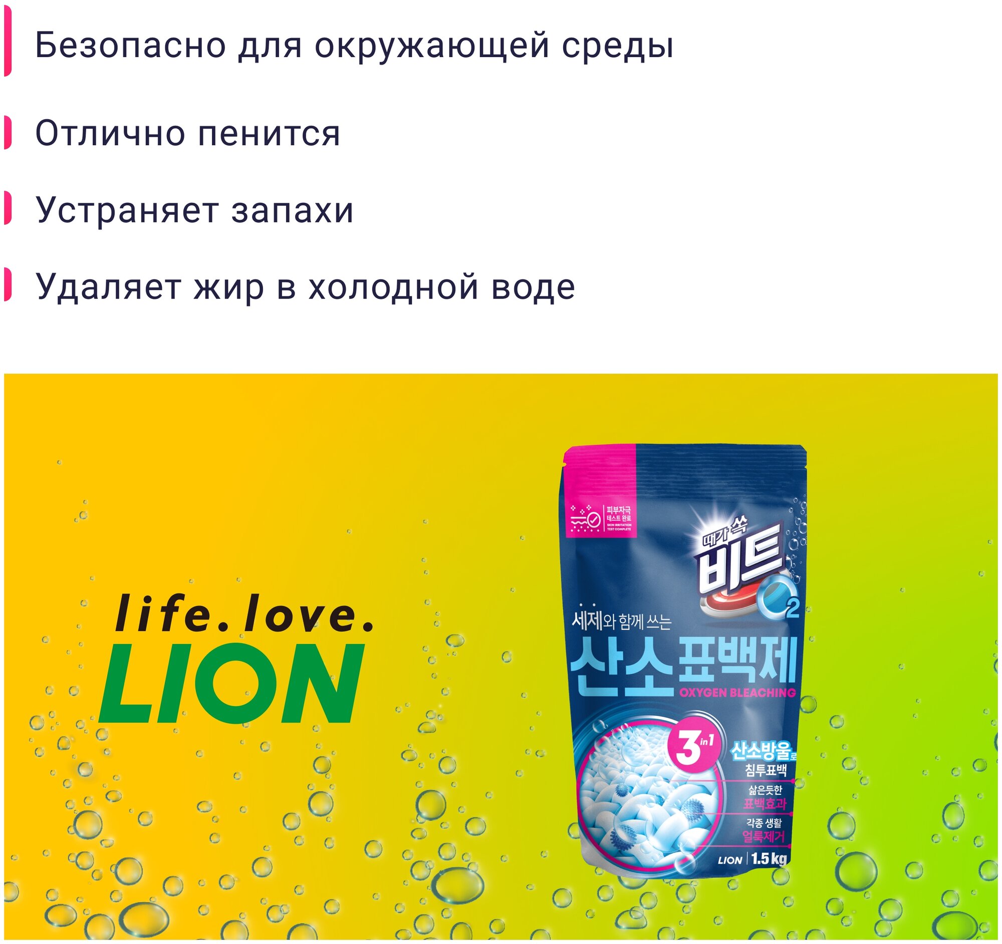 Lion Beat O2 Кислородный отбеливатель порошоковый дезинфицирующий 1,5 кг на 88 стирок