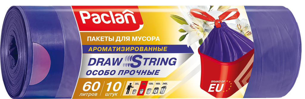 Мешки для мусора с завязками Paclan "Draw String Aroma" фиолетовый, 60 л, 10 шт в рулоне