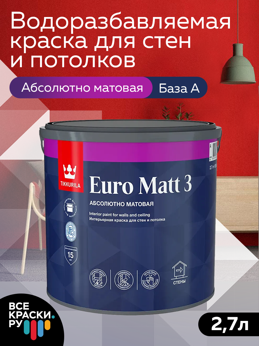 Tikkurila Euro Matt 3 Краска интерьерная для стен и потолков (белый, глубокоматовый, база A, 2,7 л)
