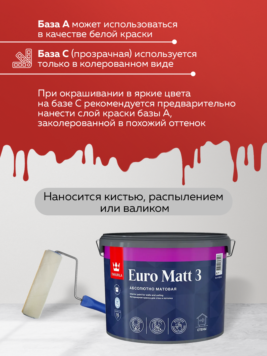 Tikkurila Euro Matt 3 Краска интерьерная для стен и потолков (под колеровку, глубокоматовый, база C, 9 л)