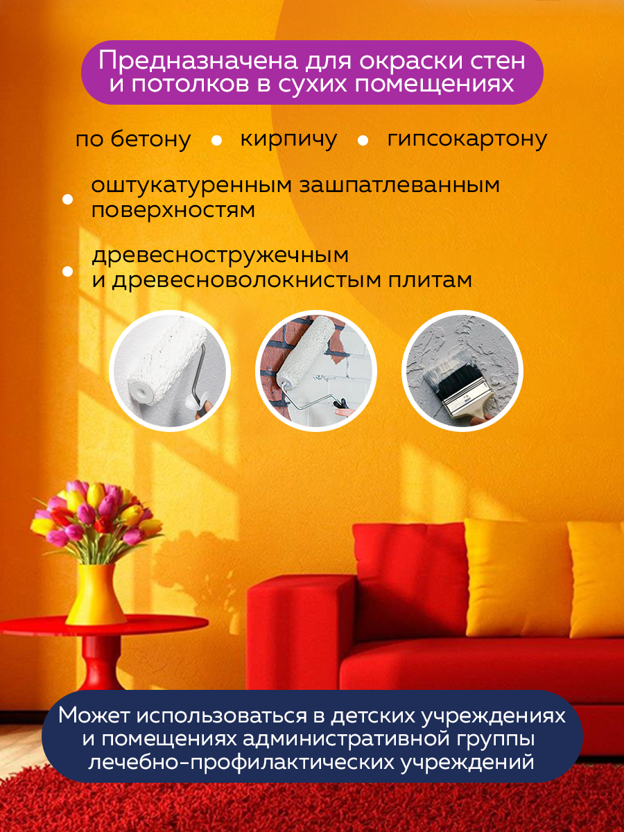 | Плюсы: | Краска на основе ПВА. Износостойкость не самая лучшая. Для потолка отличный вариант . |