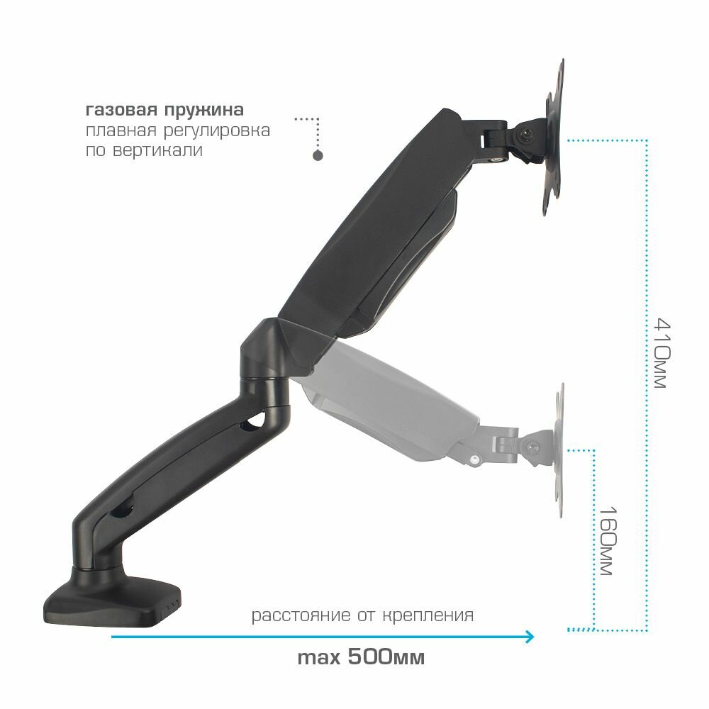 | Плюсы: | Реально длинный вылет штанги, Газлифт позволяющий регулировать монитор по высоте, не меняя угол наклона экрана. А так же, регулировка вперёд-назад не меняя угол поворота по горизонтали. В общем, все удобства, которые можно придумать, есть в этом кронштейне. Кроме разве что парочки: |