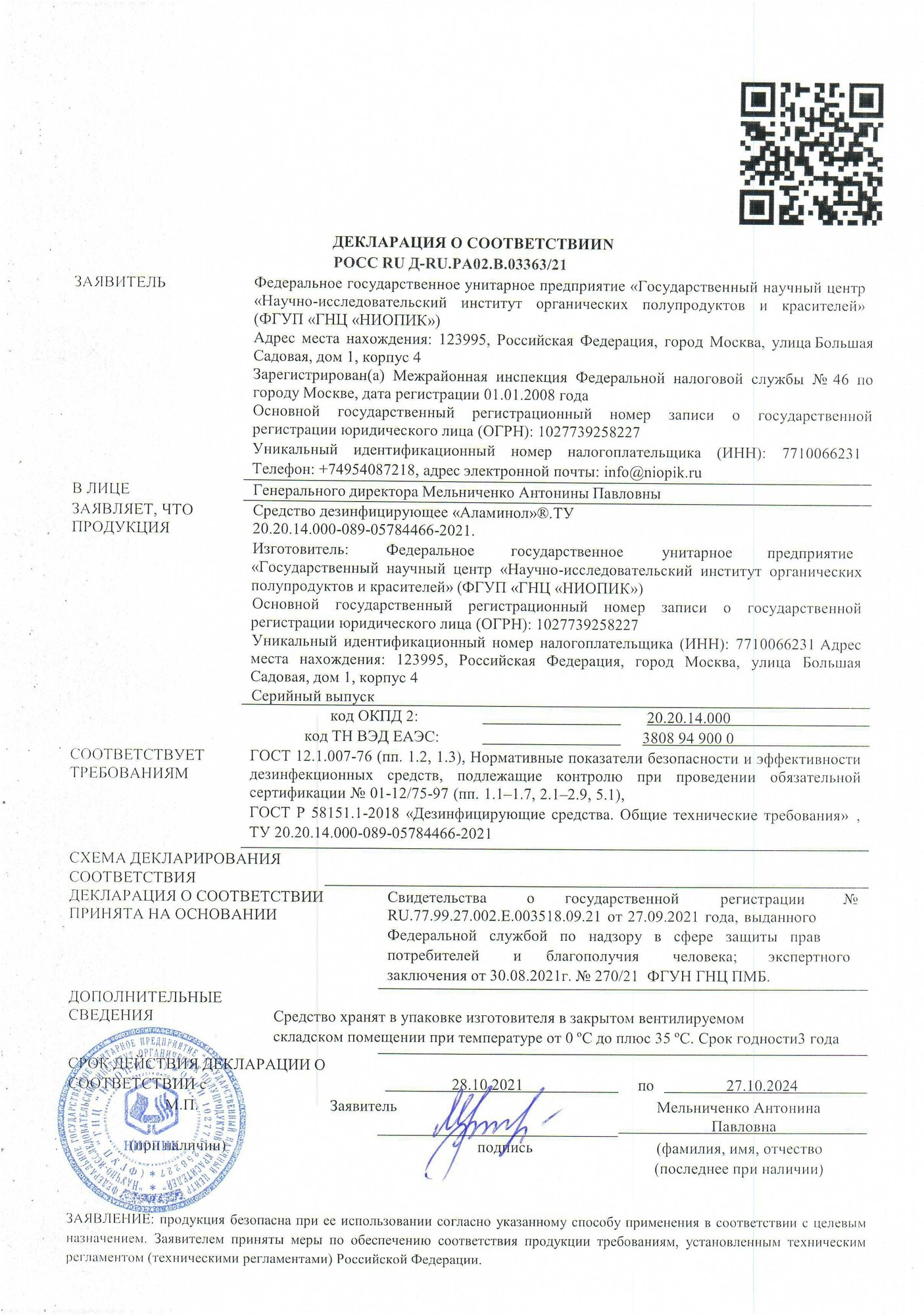 Дезинфицирующее средство Аламинол ниопик, 1 литр