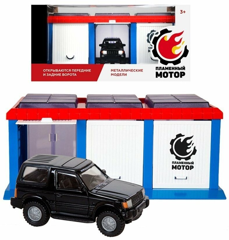 Гараж Пламенный мотор Город, открываются передние и задние ворота, джип металлический 1:43 (870271)