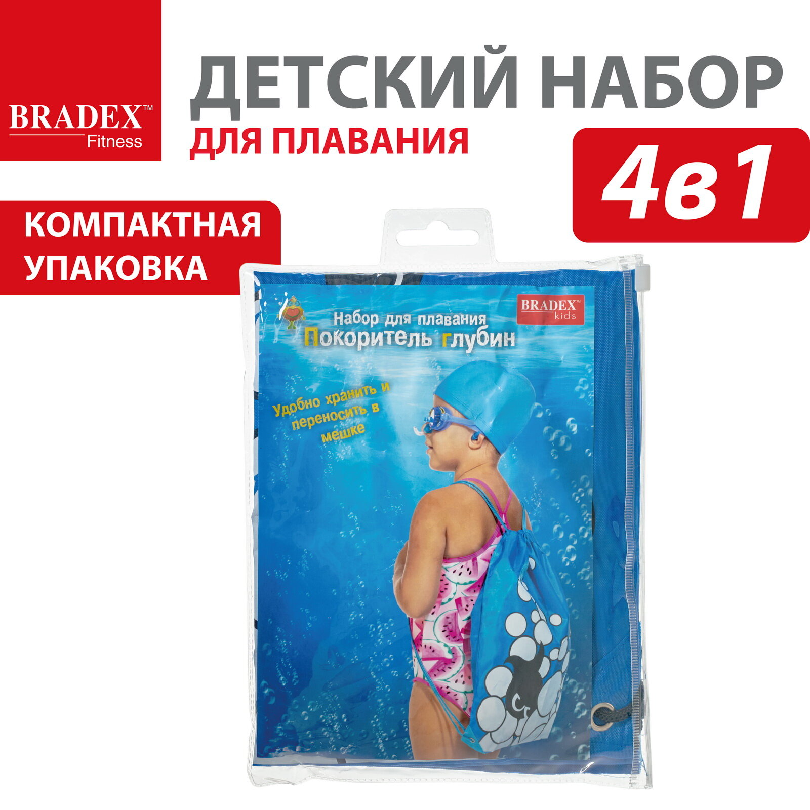 Купить Набор для плавания детский Bradex "Покоритель глубин" шапочка для плавания, очки, беруши, клипса для носа, мешок для хранения набора.