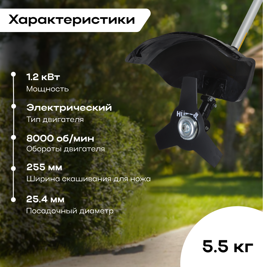 | Особенности | разборная штанга; питание от сети - 220 В, частота тока - 50 Гц; ширина скашивания ножом 25.5 см, леской - 42 см; тип режущего ножа 3T; класс электробезопасности II |