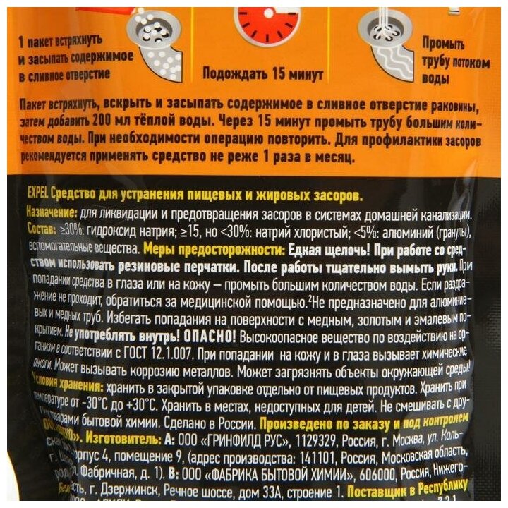 Средство для устранения засоров, EXPEL жирогон, от жира и пищевых остатков 2 саше по 50г