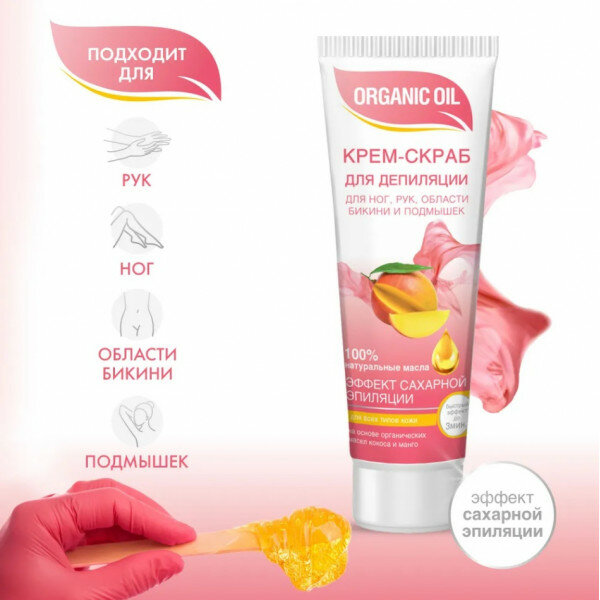 Крем-скраб для депиляции для ног, рук, бикини и подмышек Organic Oil, для всех типов кожи, туба, 100 мл
