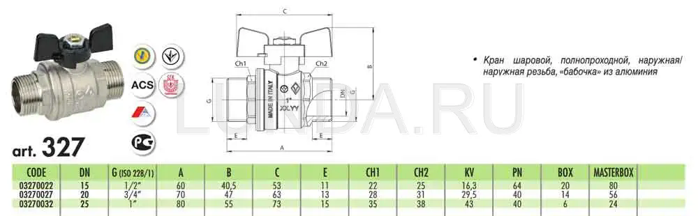 Купить Кран шаровой Bugatti (3270027) НН 3/4' бабочка OREGON серия 327 полный проход