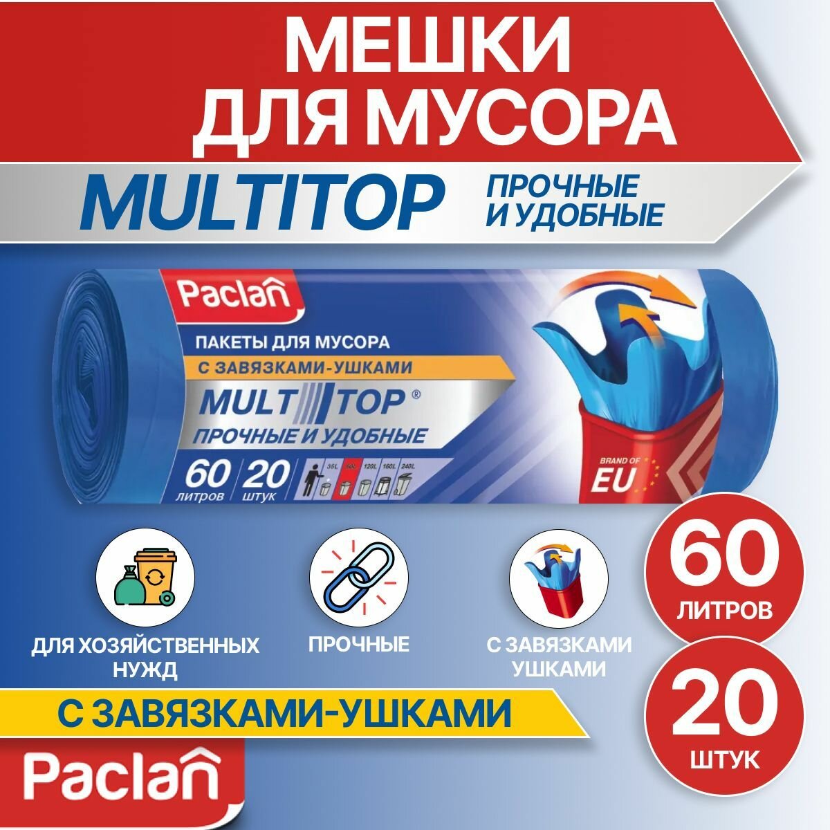 Мешки для мусора PACLAN Multitop 60л, 20шт - SEDO HOUSEHOLD products