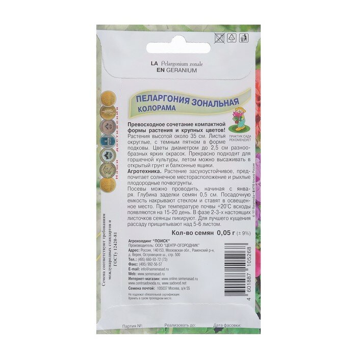 Поиск Семена цветов Пеларгония зональная "Колорама" 0,05 г интересное: