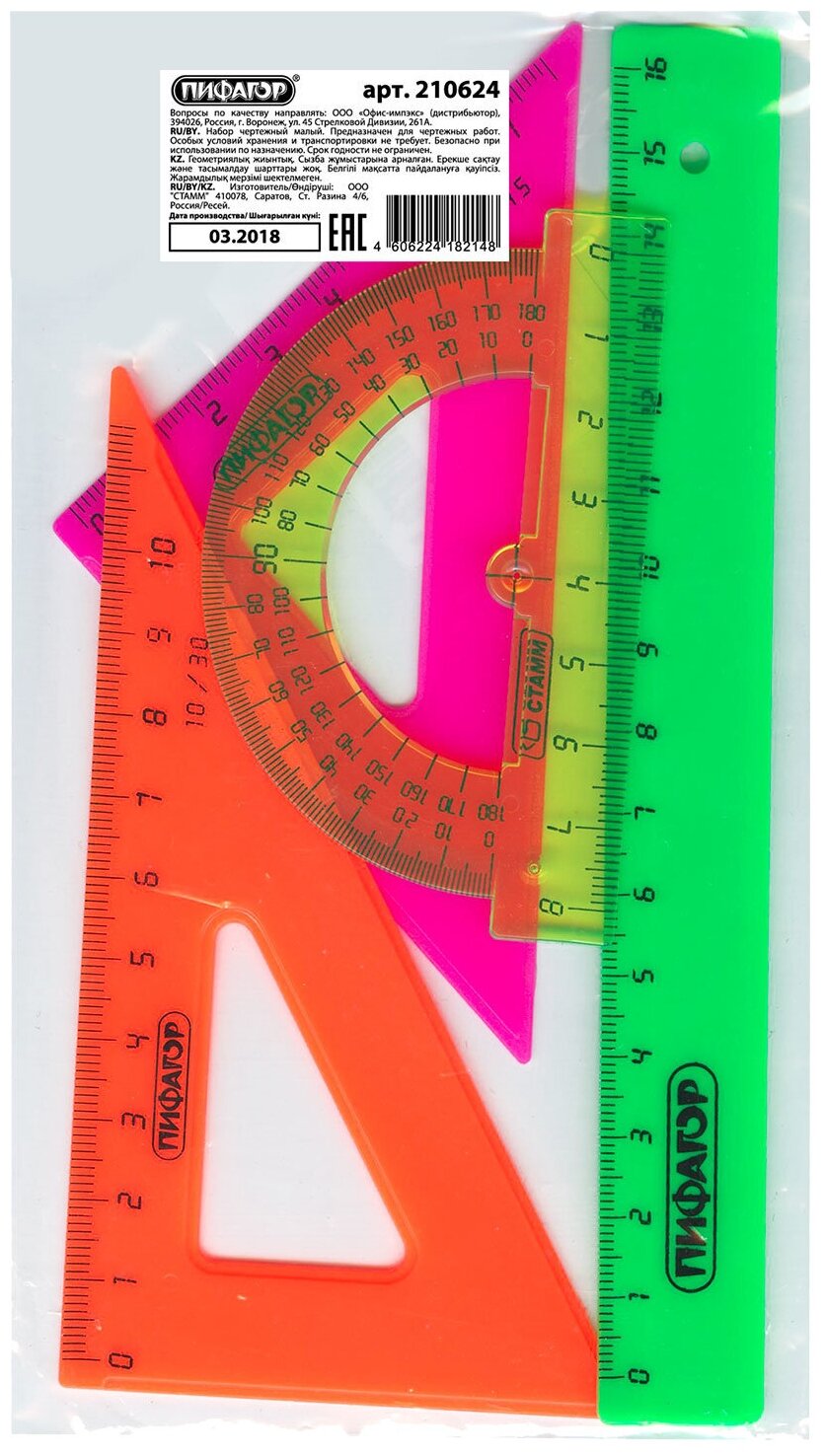 Набор чертежный малый пифагор (линейка 16 см, 2 треугольника, транспортир), непрозрачный, неоновый, пакет, 210624, 210624