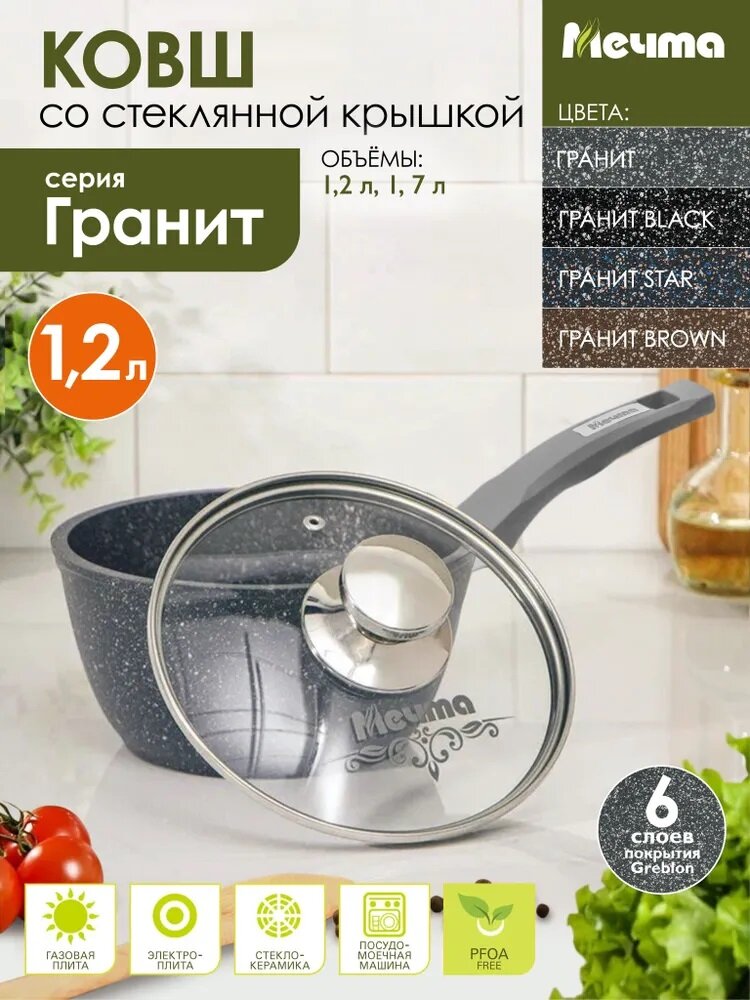 Ковш Мечта 1.2 л Гранит с антипригарным покрытием с несъемной ручкой и крышкой, НЕ индукционная