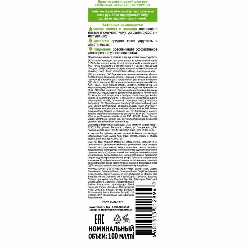 Весна Крем для рук Нежный Насыщенное питание, 100 г