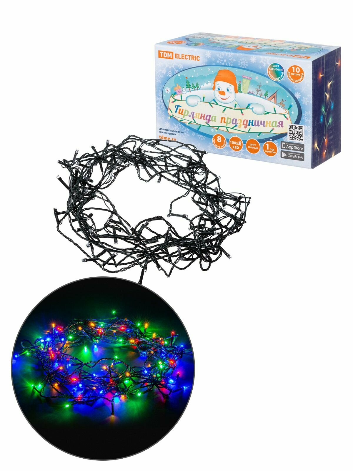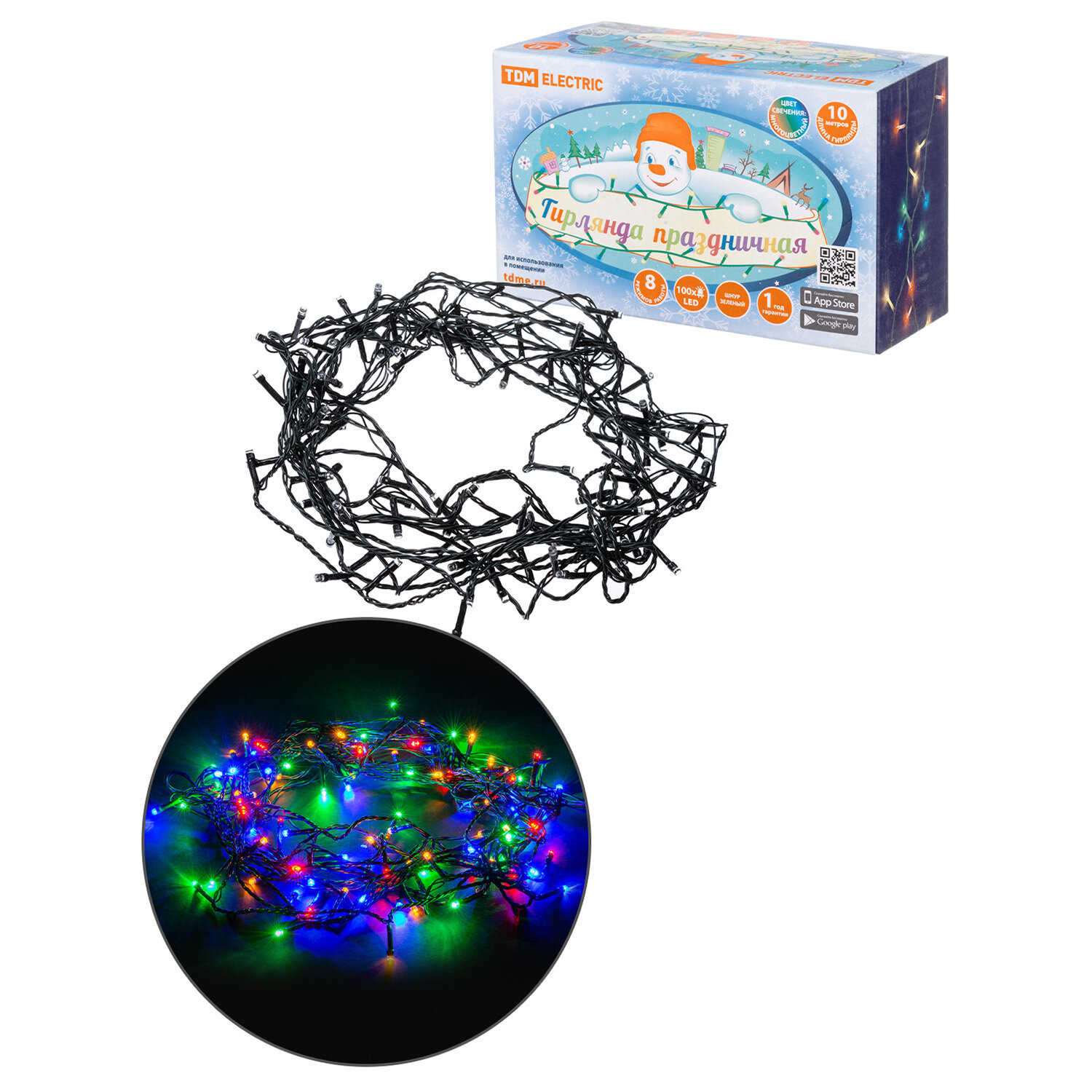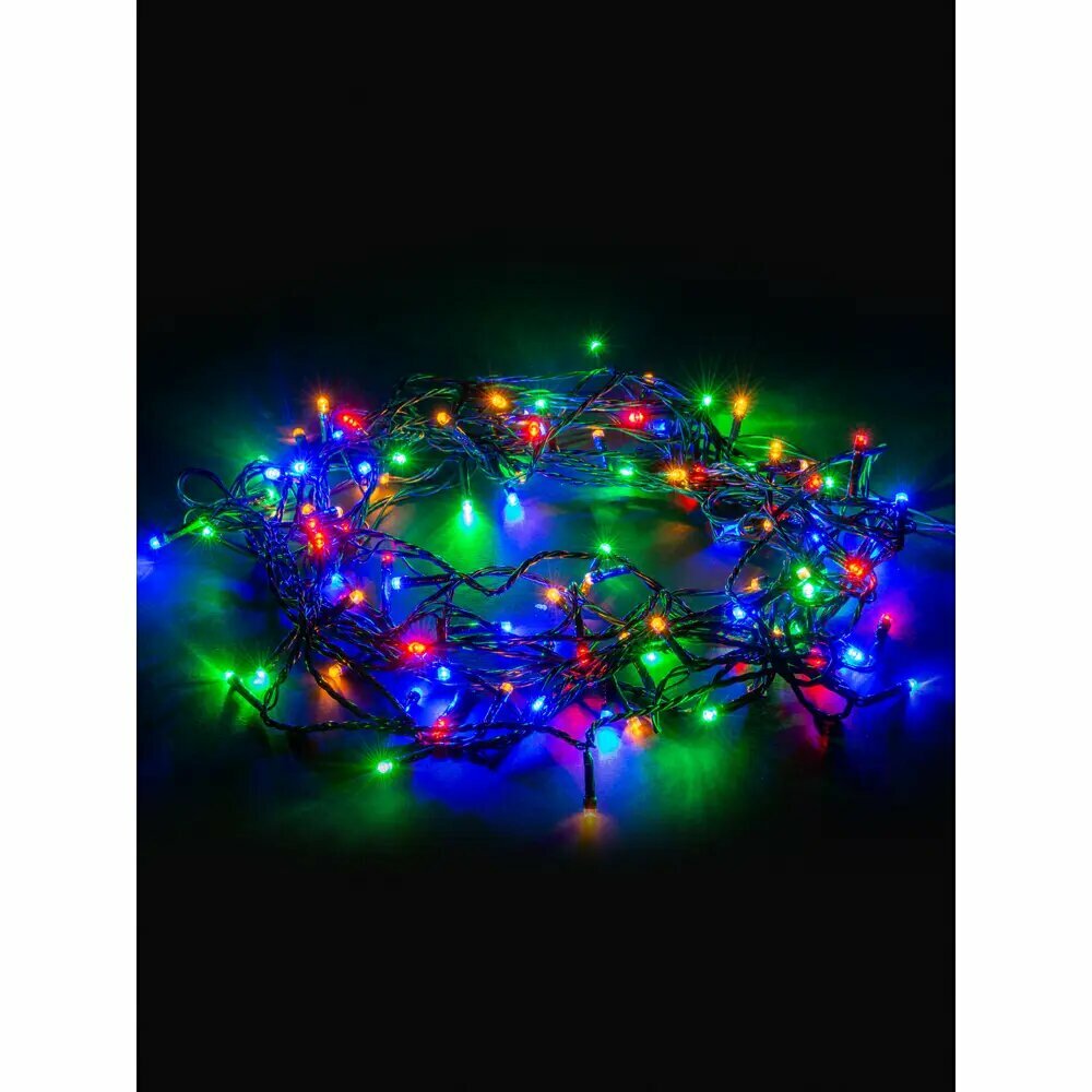 Гирлянда светодиодная TDM СГ100MЗ10, разноцветная, зеленый шнур, 10м, 8 режимов, 250 В