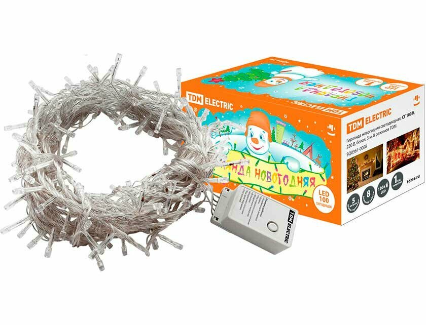 Гирлянда TDM СГ100Б10, 10м, 220В, разные режимы свечения, белый цвет, IP20