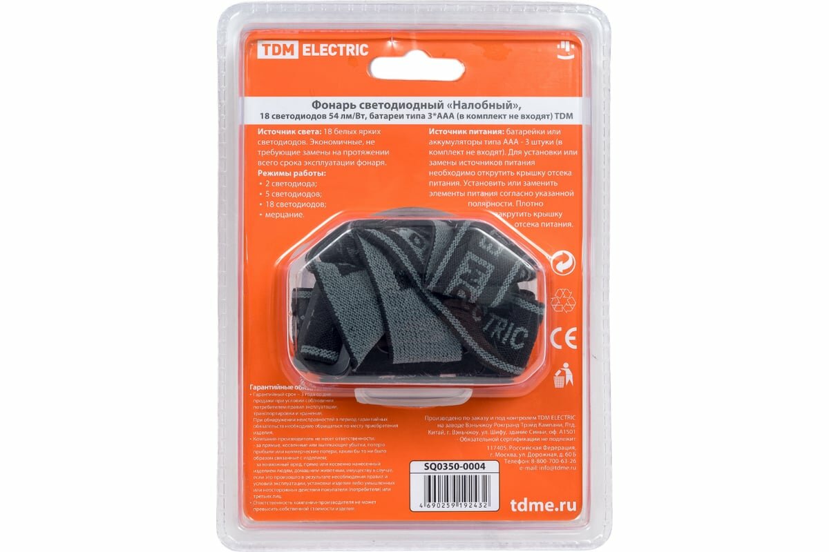 TDM Фонарь светодиодный Налобный , 18 светодиодов 54 лм/Вт, бат. 3xAAA SQ0350-0004