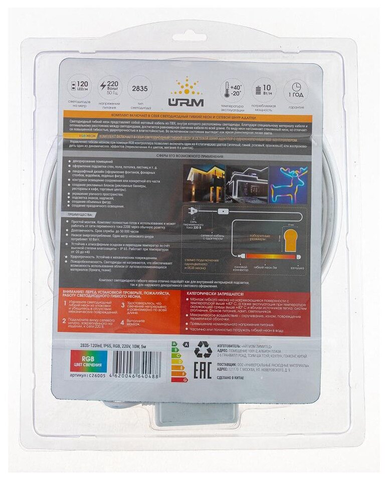 Гибкий неон URM С26005, 5 м, светодиодов: 600 шт., 100 Вт, разноцветный интересное: