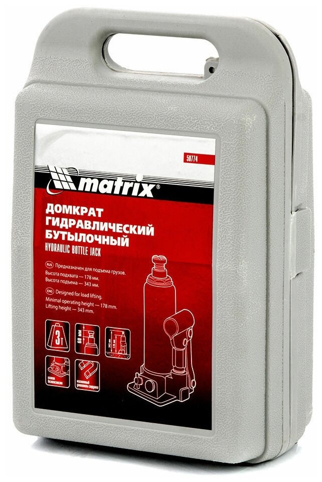 Домкрат гидравлический бутылочный, 3 т, h подъема 178-343 мм, в пластиковом кейсе Matrix ( 50774 )