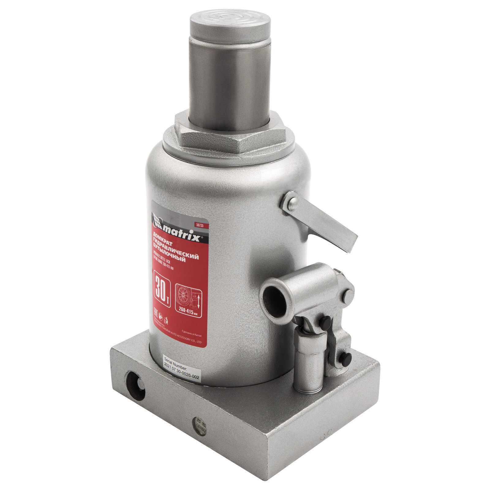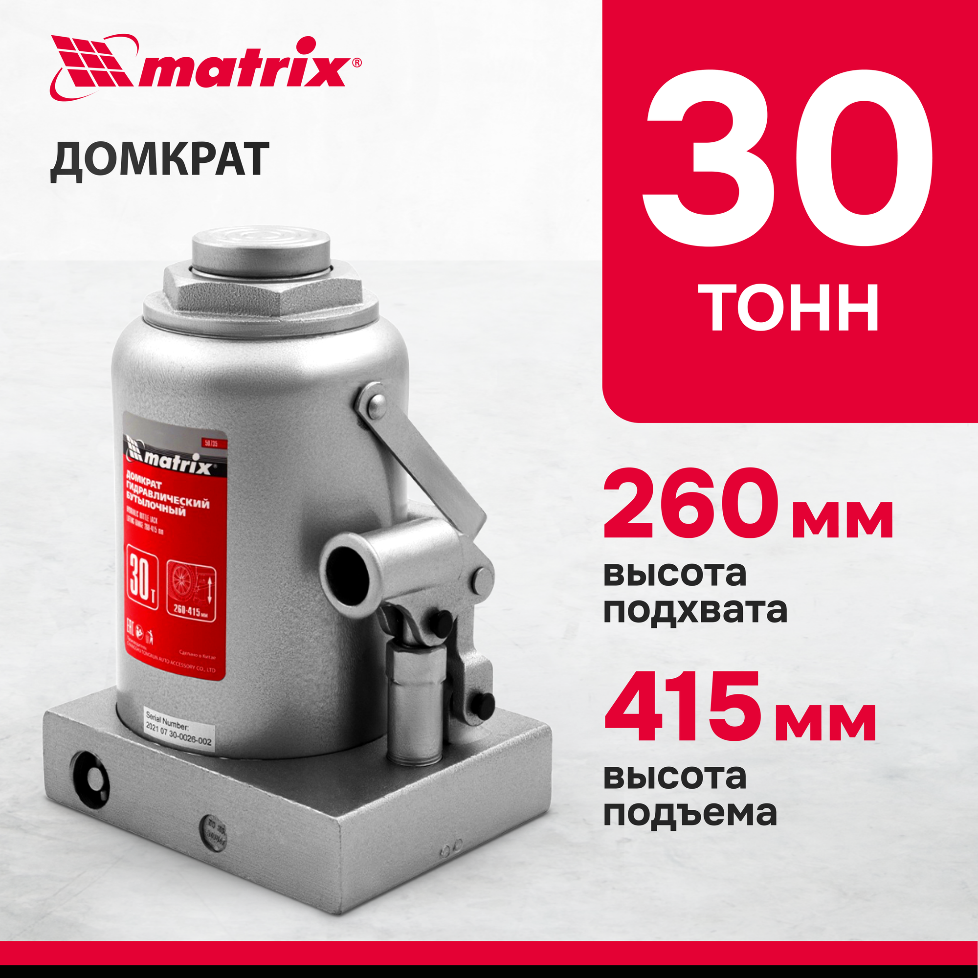 Домкрат гидравлический бутылочный, 30 т, h подъема 260-415 мм, MATRIX 50735