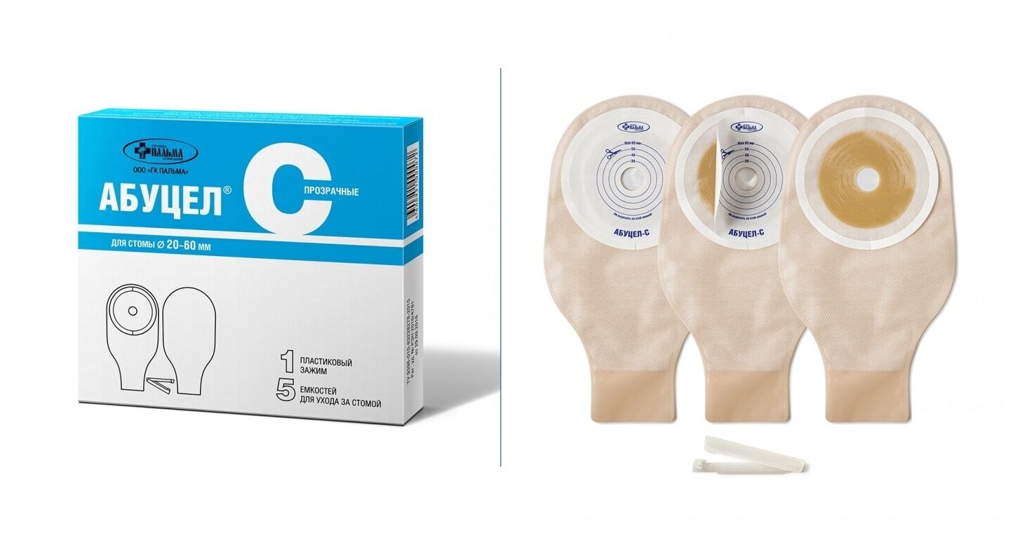 Абуцел-с пальма калоприемник дренируемый прозрачный со встроенной плоской пластиной, вырезаемое отверстие 20-60 мм, упаковка 5 штук
