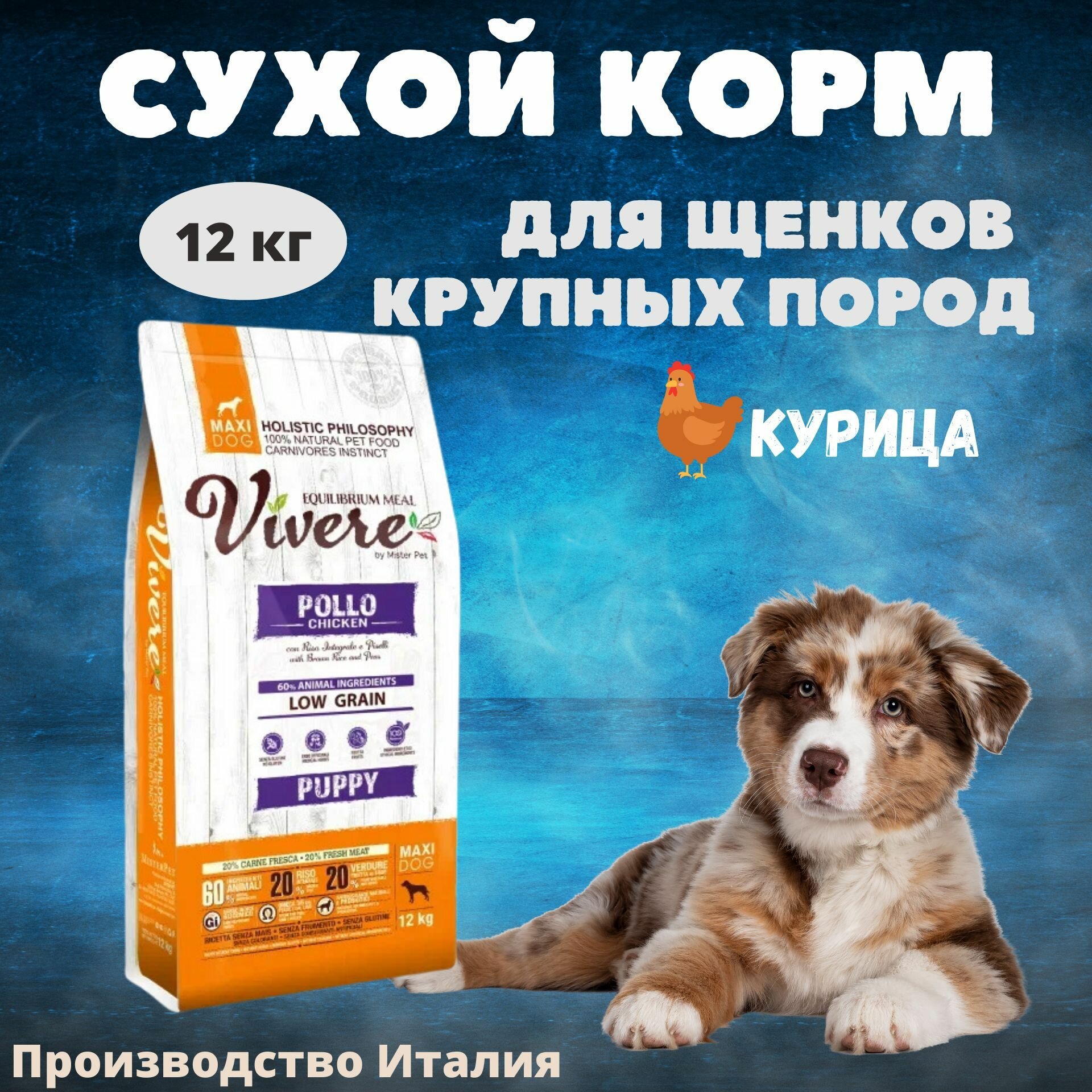 Vivere корм для щенков крупных пород, низкозерновой, курица 12 кг