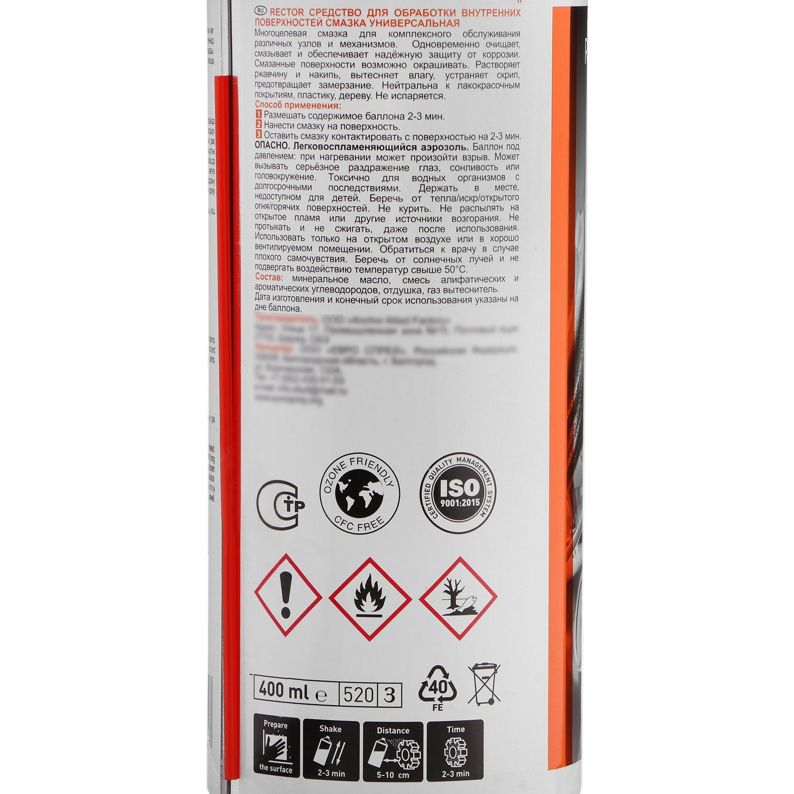 Литиевая смазка RECTOR средство для обработки внутренних поверхностей, 400 мл