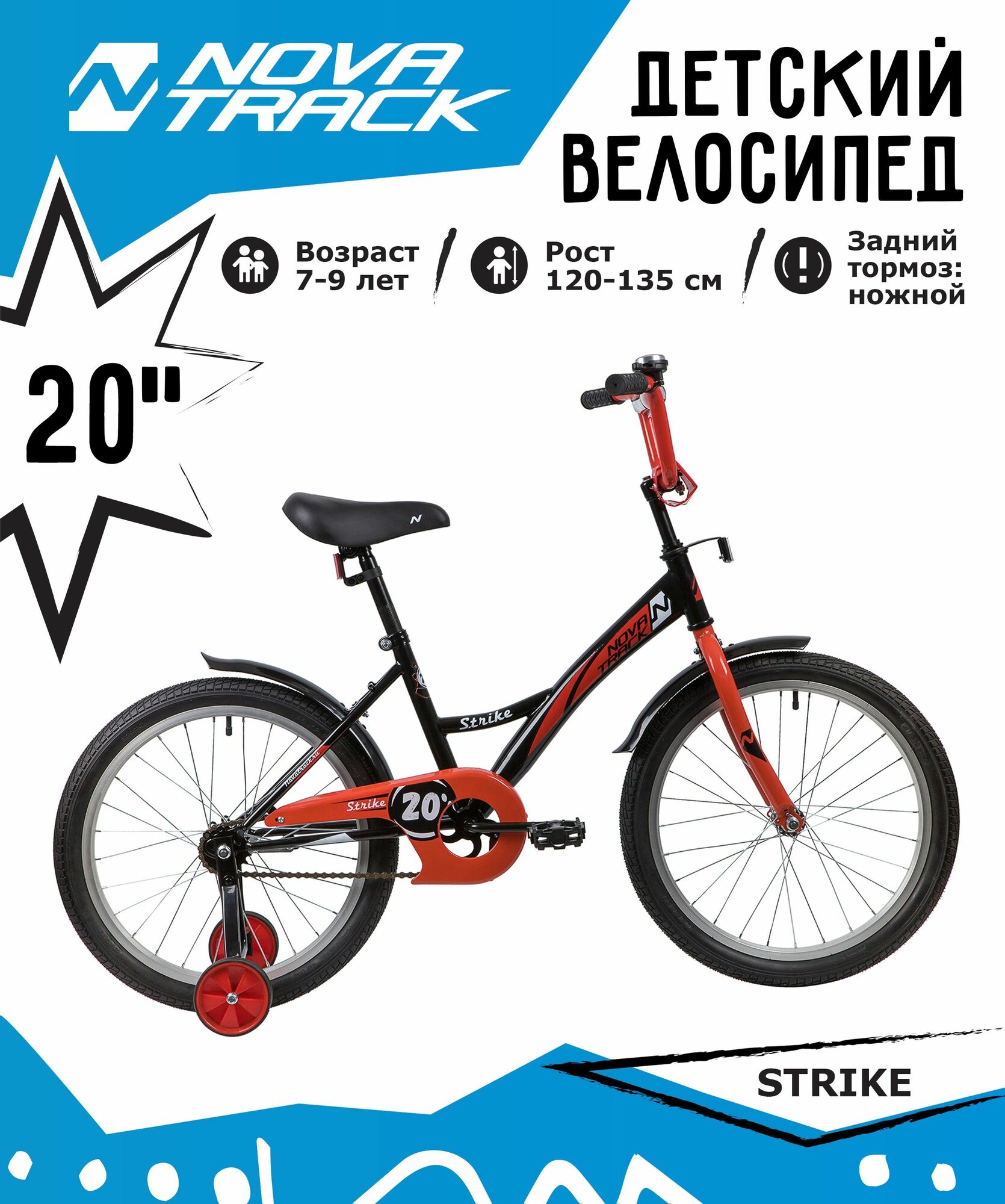 NOVATRACK STRIKE 20" (2020) (Велосипед NOVATRACK 20" STRIKE черный-красный, тормоз нож, крылья корот, защита А-тип)