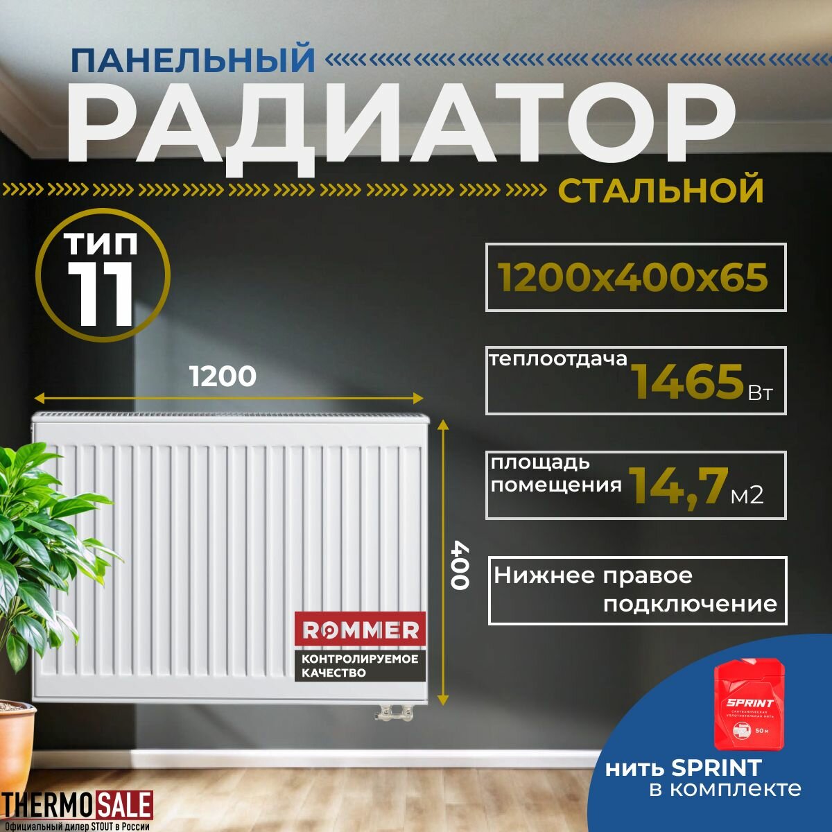 Радиатор стальной панельный 400х1200 нижнее правое подключение Ventil 11/400/1200 Сантехническая нить 20 м