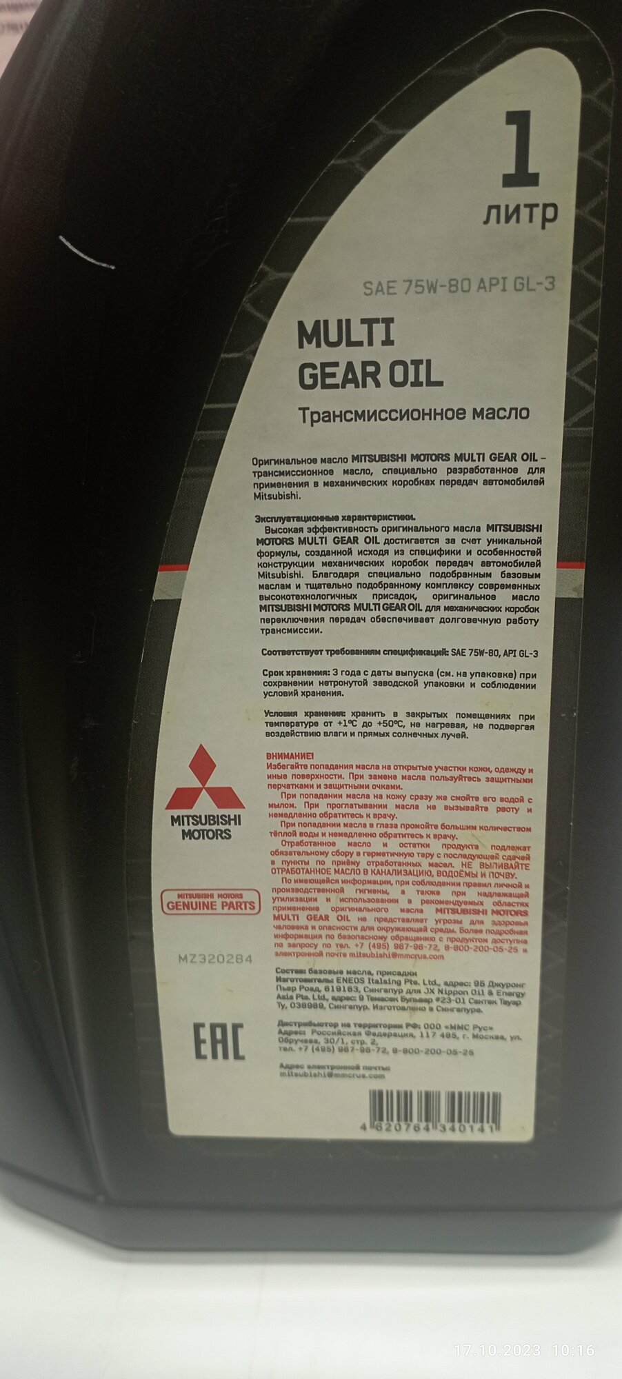 MITSUBISHI MZ320284 Масло трансмиссионное Mitsubishi Multi Gear Oil 75W80 1 л MZ320284 1шт